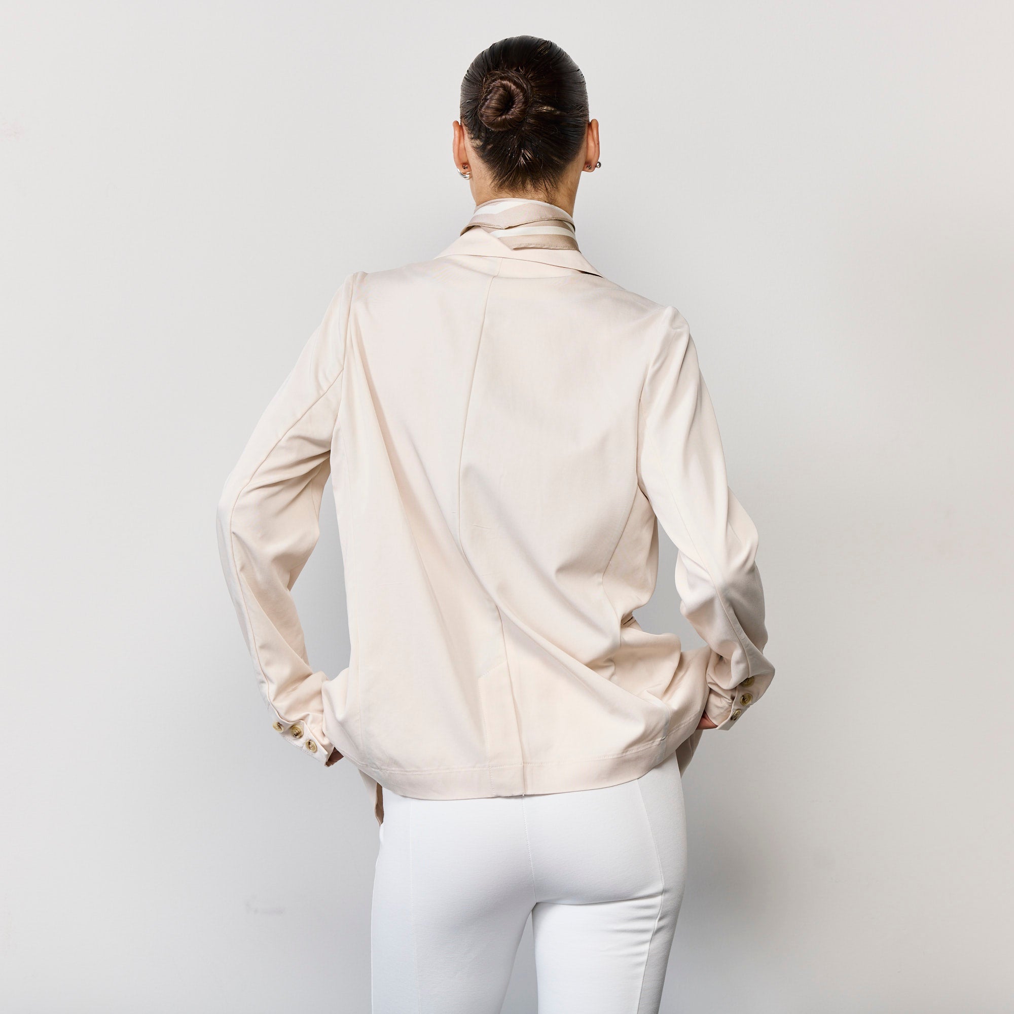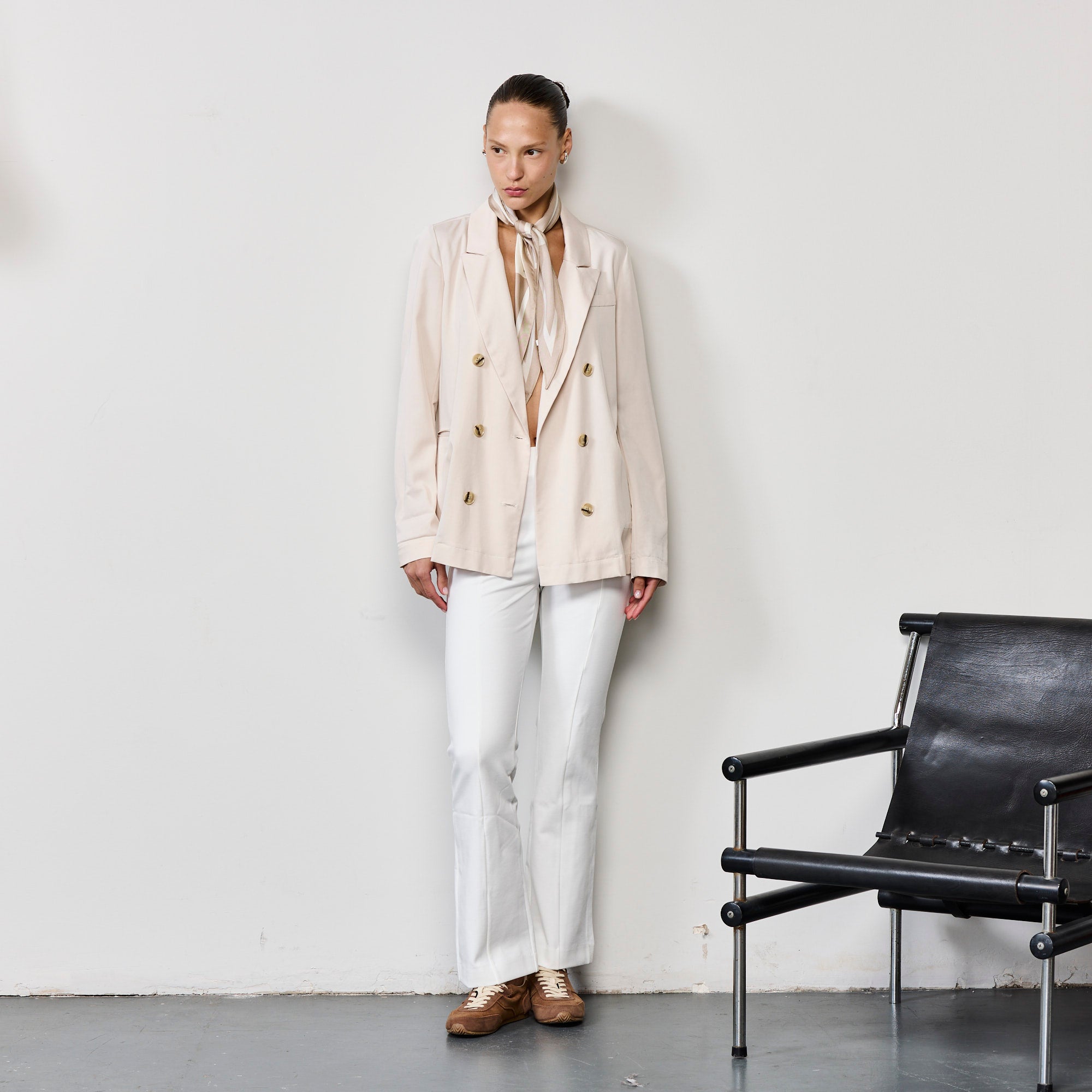 בלייזר קליל עם רכיסה כפולה, עשוי 65% טנסל 35% פולי, רך ונעים, מעובד בעיבוד פנימי בקונטרסט שחור בחלק הפנימי, בגזרת אוובר סייז, הדוגמנית לובשת מידה מדיום