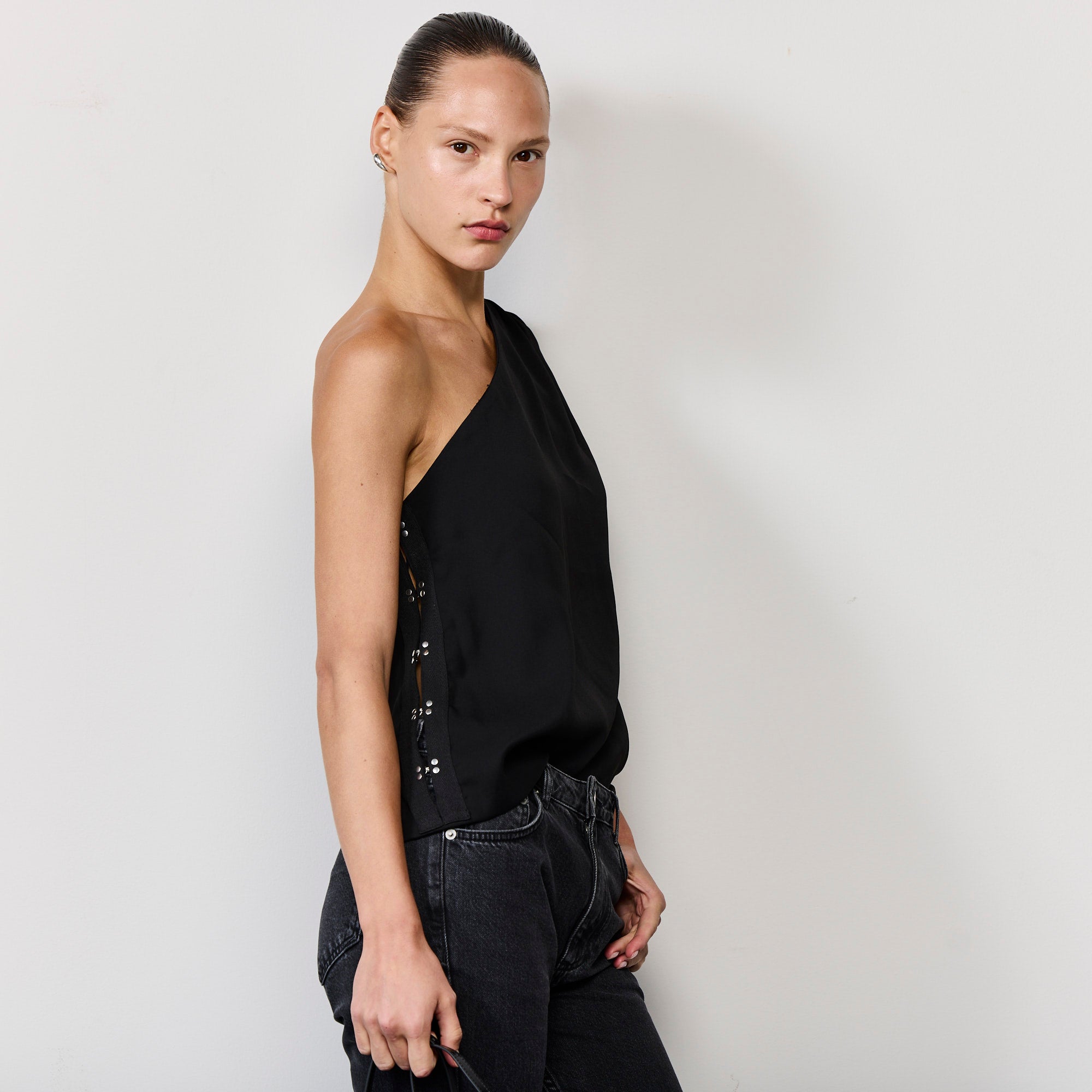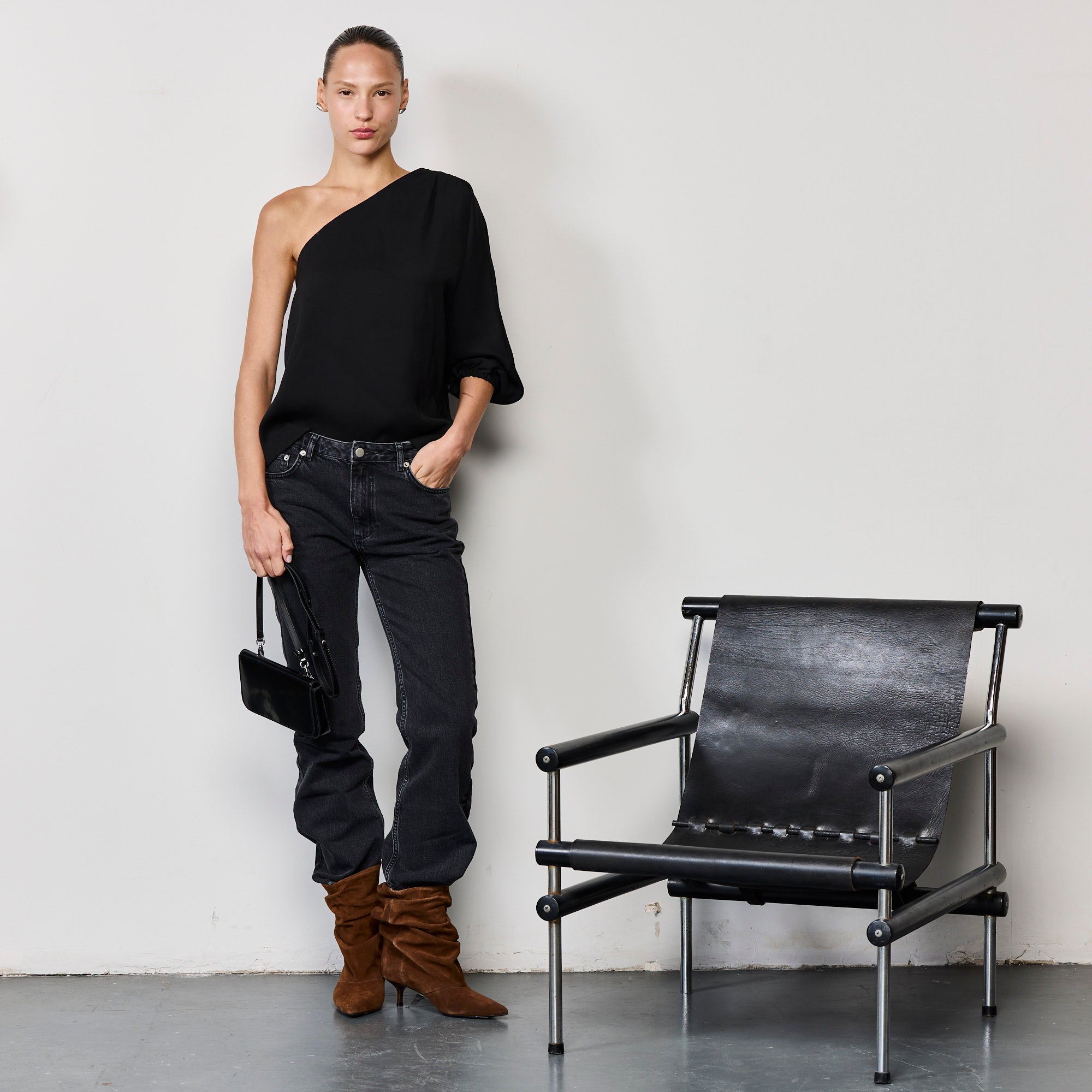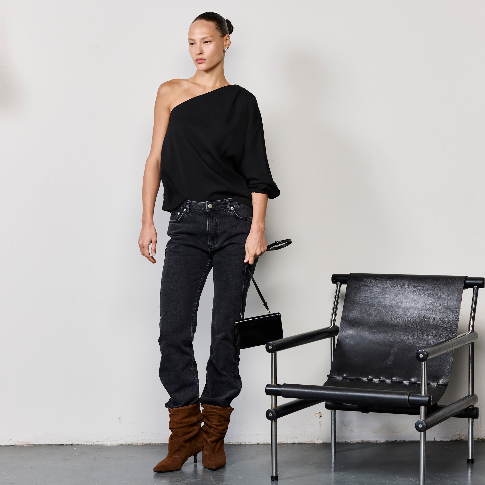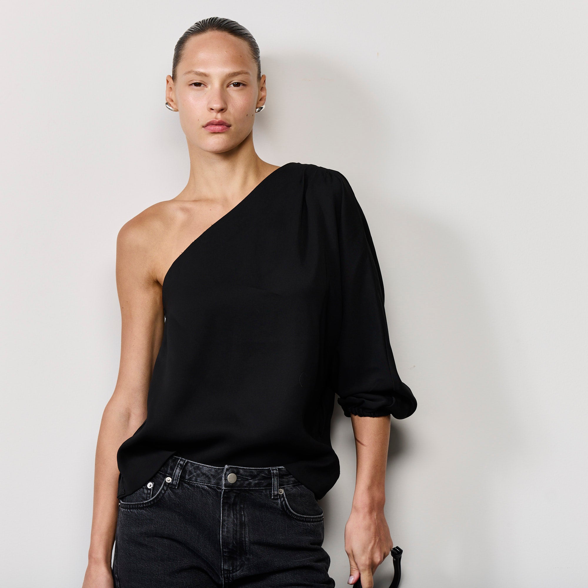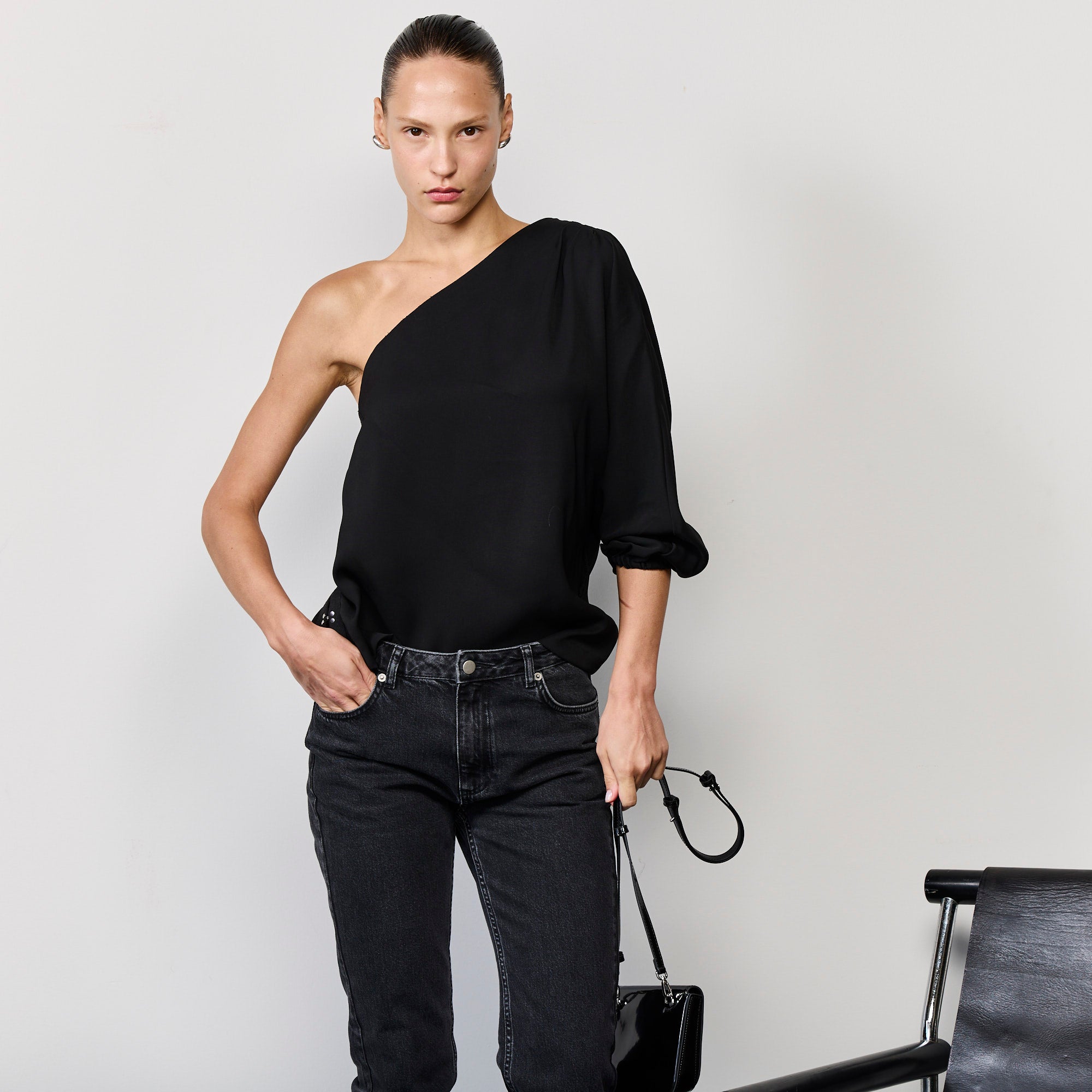 חולצת שרוול אחד,עם מפתח של שורת קרסים בתפר צד, רפויה ורחוקה מהגוף ונותנת מראה נונשלנטי ולא מתאמץ , הדוגמנית לובשת מידה סמול