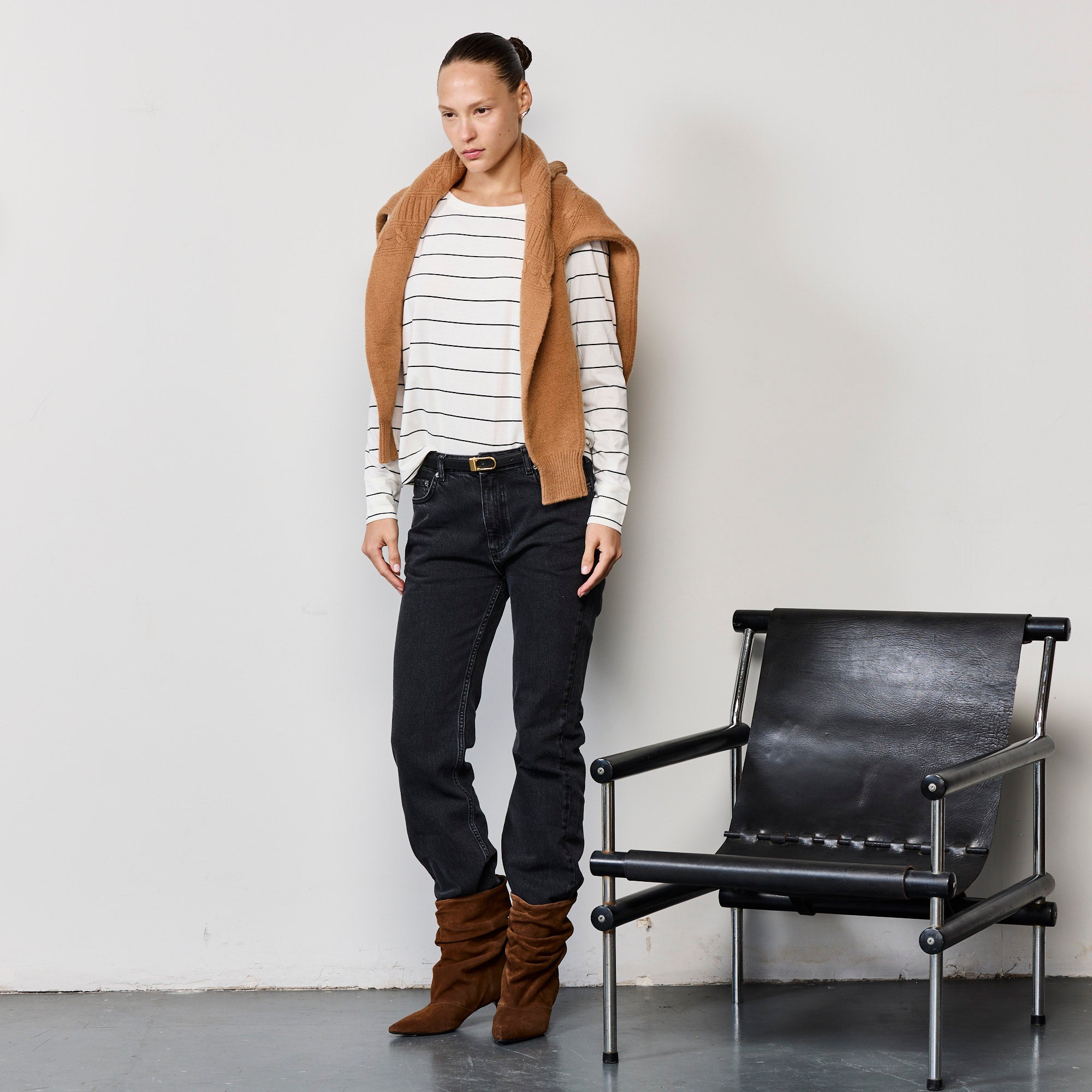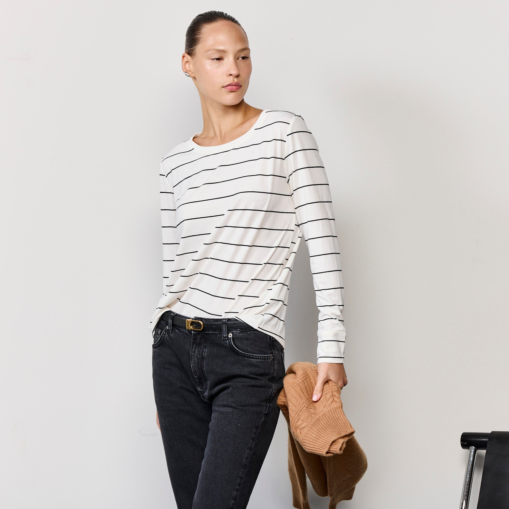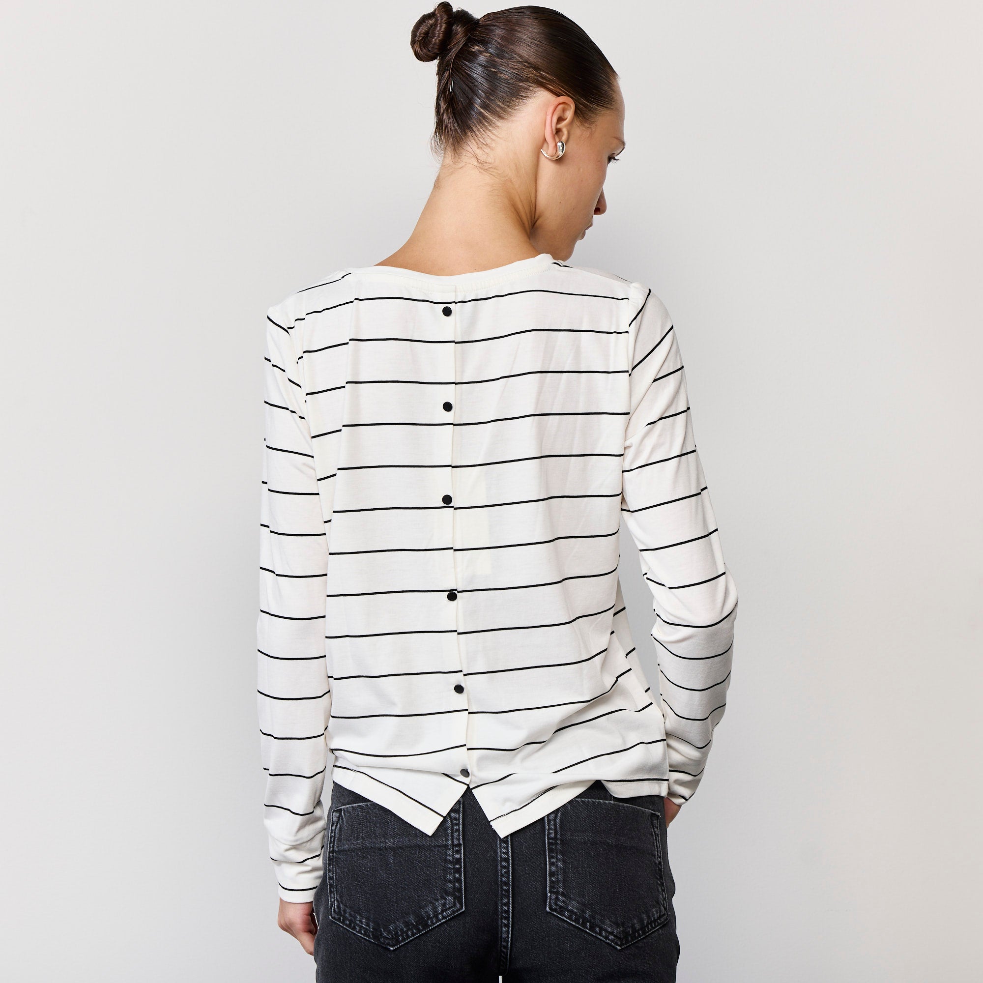 חולצת פסים קלאסית עם כפתורים בחלק האחורי, עשויה 91% ראיון, 4% פולי 5% ספנדקס , הדוגמנית לובשת מידה סמול