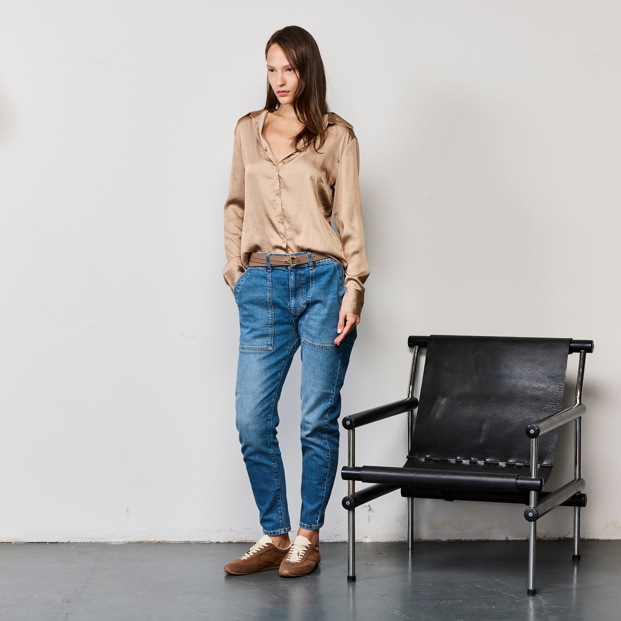 חולצה מכופתרת עם מפתח צוואר נשי ומחמיא, חלקה האחורי של החולצה עשוי ריב רך ונעים שנותן לחולצה אלסטיות, הדוגמנית לובשת מידה סמול, הרכב הבד : חלק קדמי 100% סאטן, חלק אחורי 100% מודל