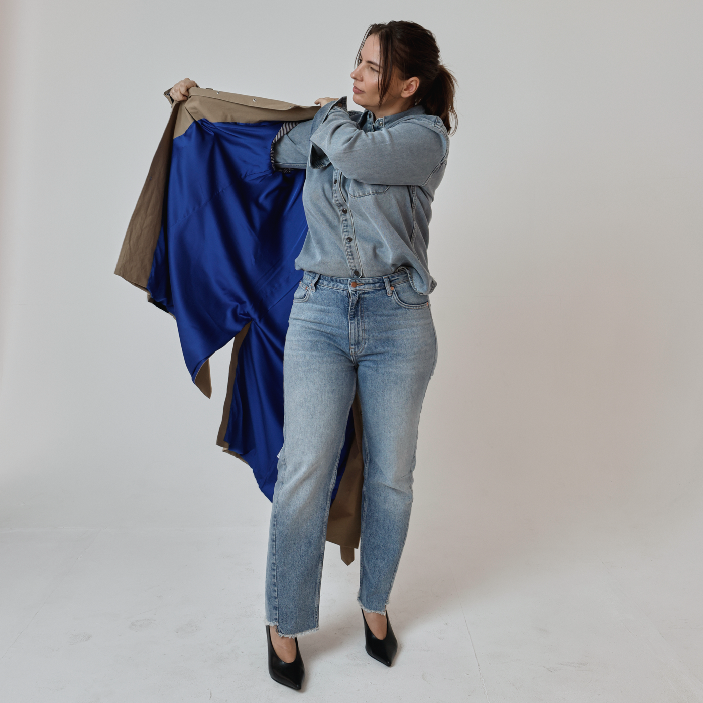 ג׳קט טרנץ מחויט עשוי 73% כותנה 27% ניילון, מלא בדיטיילים והפתעות, קונטרסט שחור בצידי הטרנץ , ביטנה בקונטקסט כחול וביטנת השרוולים בבד פסים, הטרנץ מגיעה עד מידה אקסטרא לארג׳