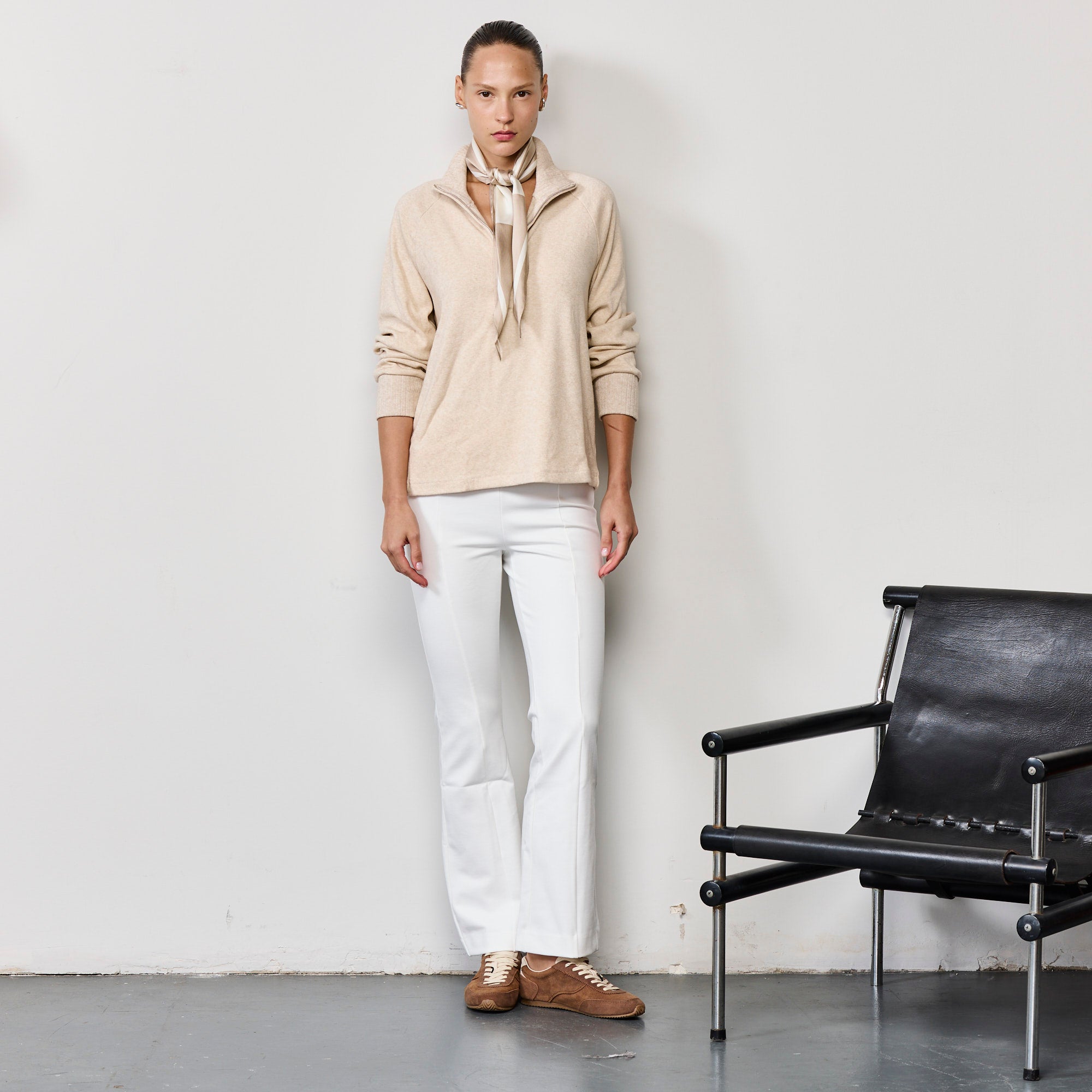 סריג רך ונעים, עשוי ראיון מעורב, עם רוכסן בקדמת הסריג וסיומת של ריב בצווארון ובשרוולים, הדוגמנית לובשת מידה מדיום