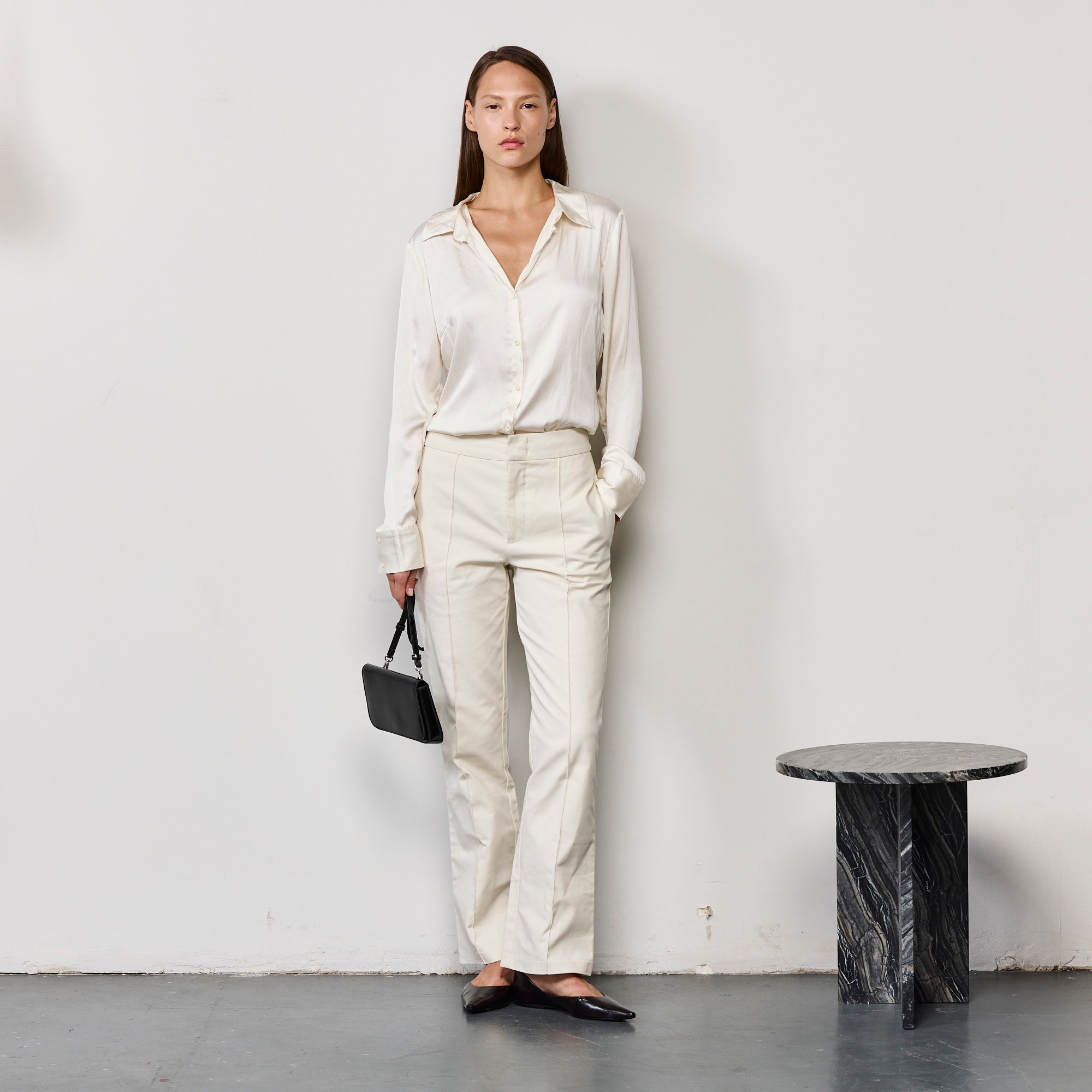 מכנסיים מחוייטים בגזרת מותן גובהה, עם רגל רחבה וישרה, עשויים 73% כותנה 24% פולי 4% אלסטן, עם תיפור דקיק באמצע הרגל למראה ארוך ומחמיא, המידות גדולות יחסית, הדוגמנית לובשת מידה אקסטרא סמול,