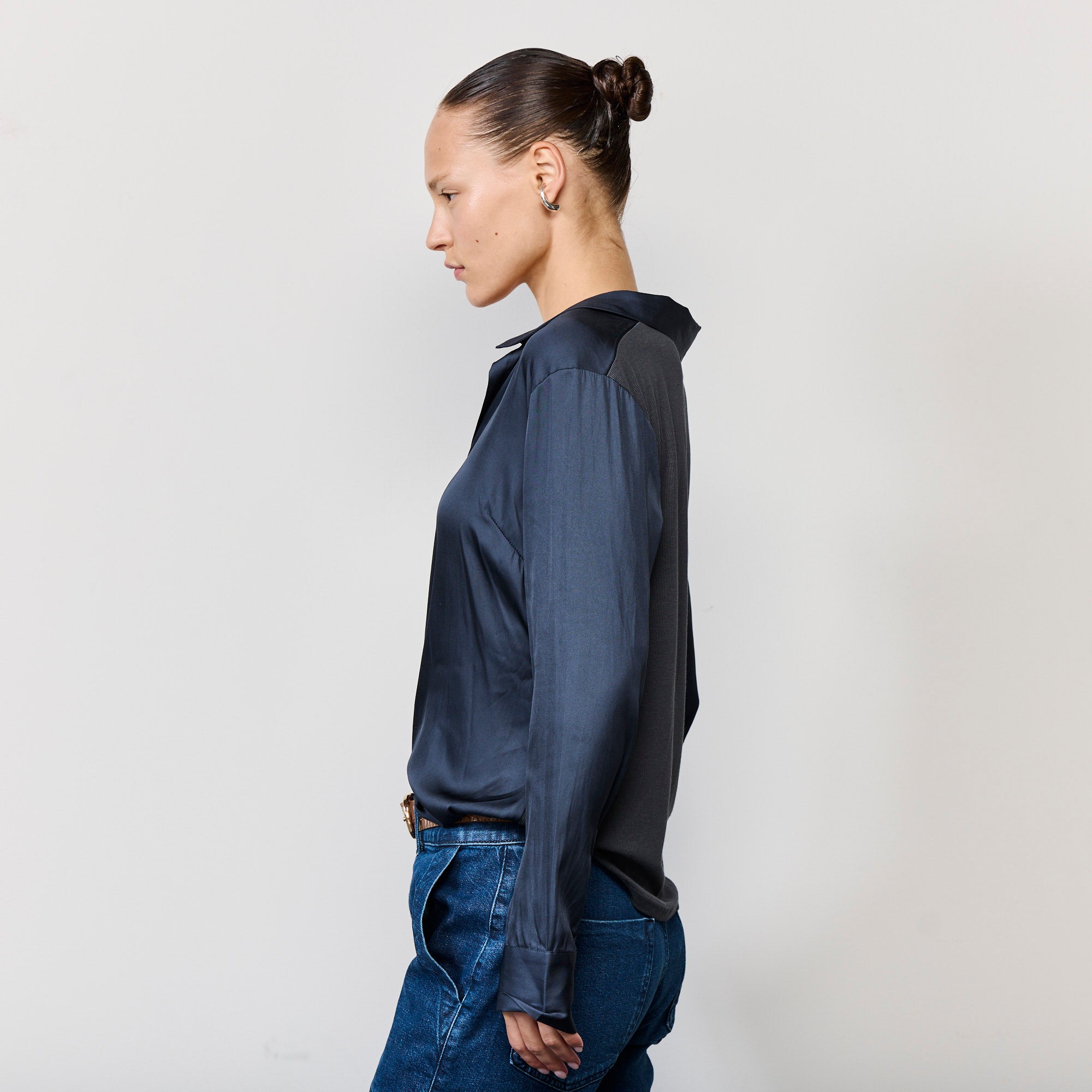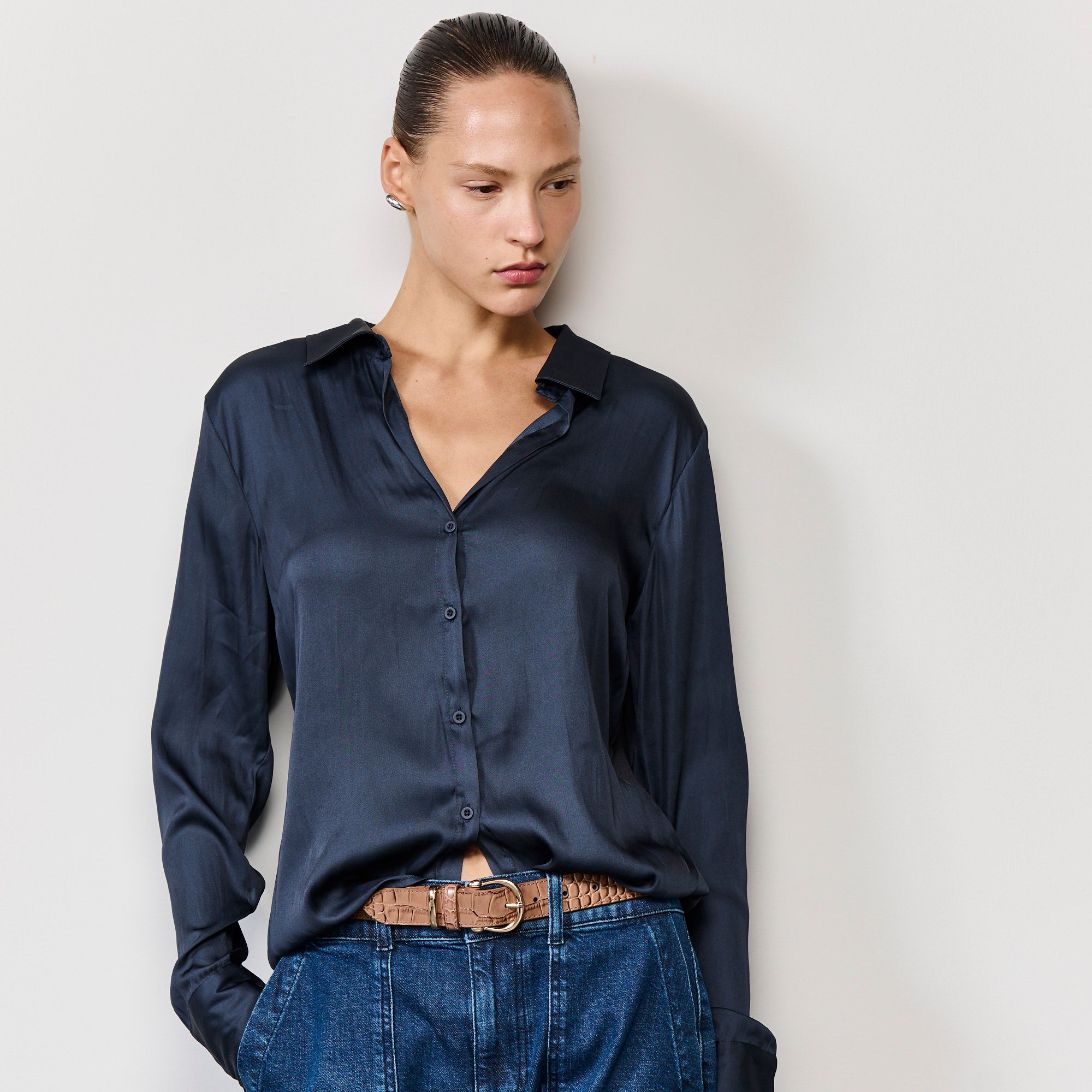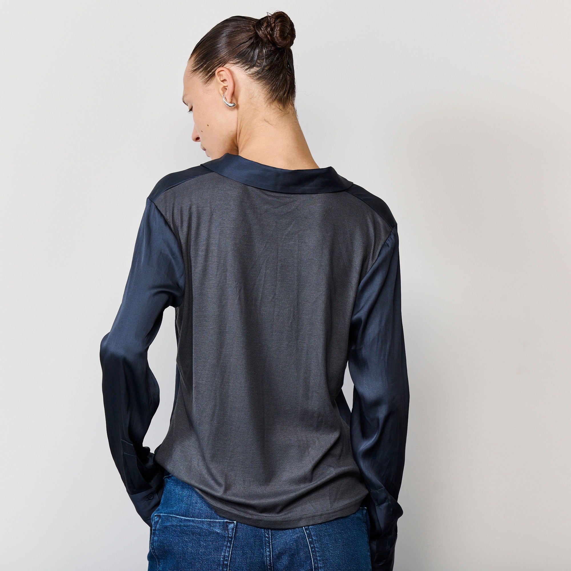 חולצה מכופתרת עם מפתח צוואר נשי ומחמיא, חלקה האחורי של החולצה עשוי ריב רך ונעים שנותן לחולצה אלסטיות, הדוגמנית לובשת מידה סמול, הרכב הבד : חלק קדמי 100% סאטן, חלק אחורי 100% מודל