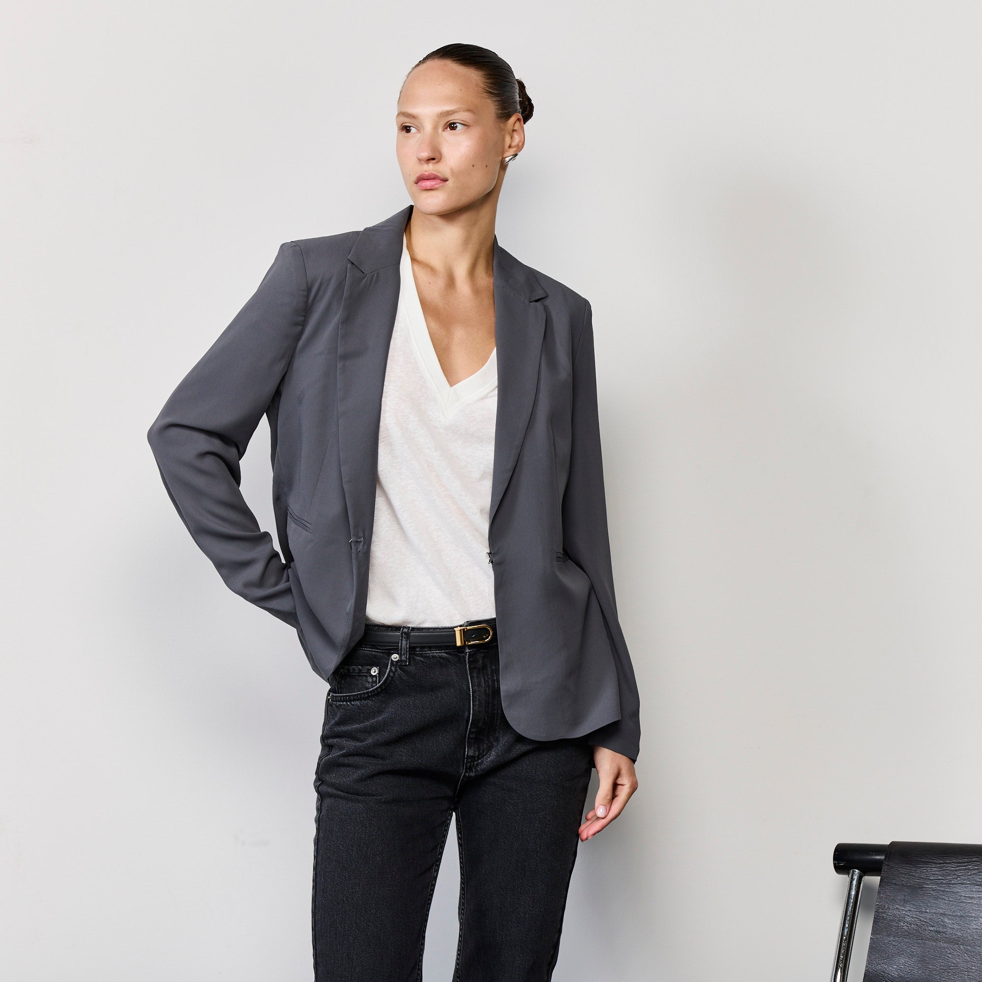 הבלייזר המחוייט האולטימטיבי, עם הגזרה הקלאסית והמדויקת, קל ולא קמיט, מעובד עם פספול בקונטרסט שחור מבפנים, בטנת השרוולים בצבע קונטרסט עם כפתרה נסתרת, דוגמנית בגובה 175 ס״מ לובשת מידה MEDIUM .