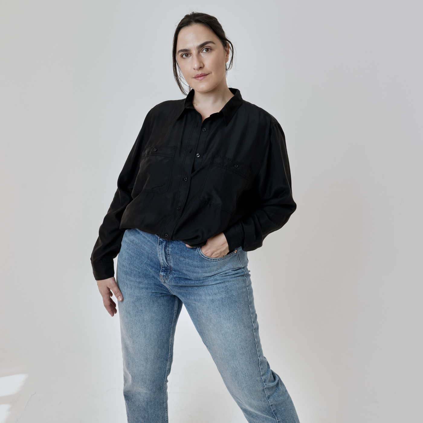 חולצה מכופתרת 100% משי, בגזרה רפויה ונינוחה, עם שני כיסים קדמיים, ועניבה שניתנת להסרה בקלות, החולצה עברה צביעת garment dye שמאפשרת כביסה במכונה , החולצה מגיעה עד מידה אקסטרא לארג׳